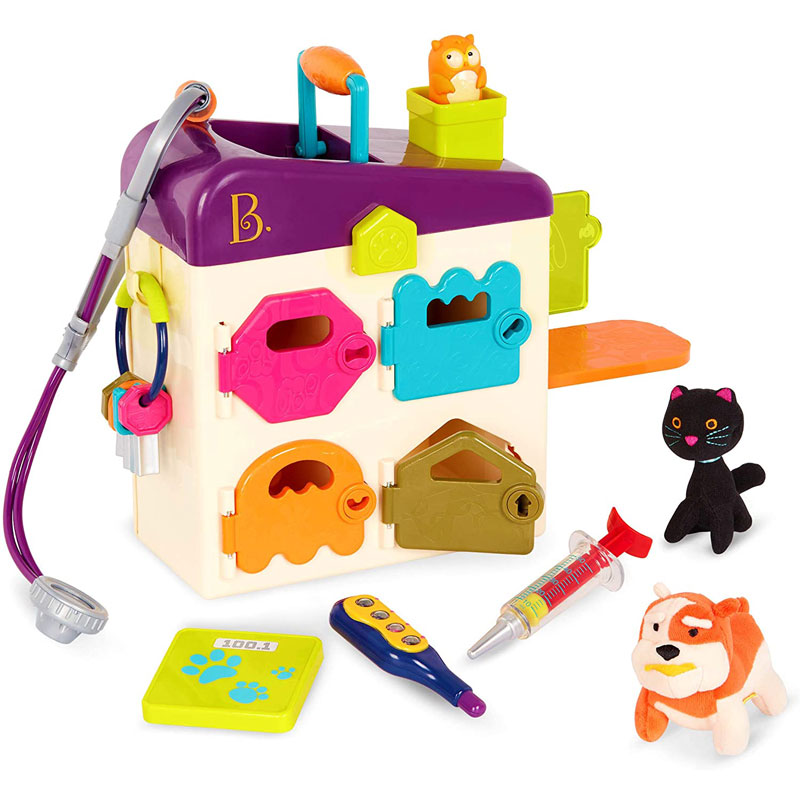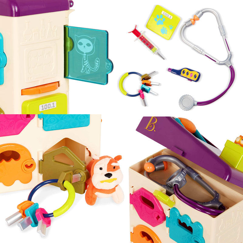| 配件清單 | 寵物診所本體 聽診器 溫度計 針筒 鎖匙串(4支鎖匙) 玩偶貓 玩偶狗 體重計 |