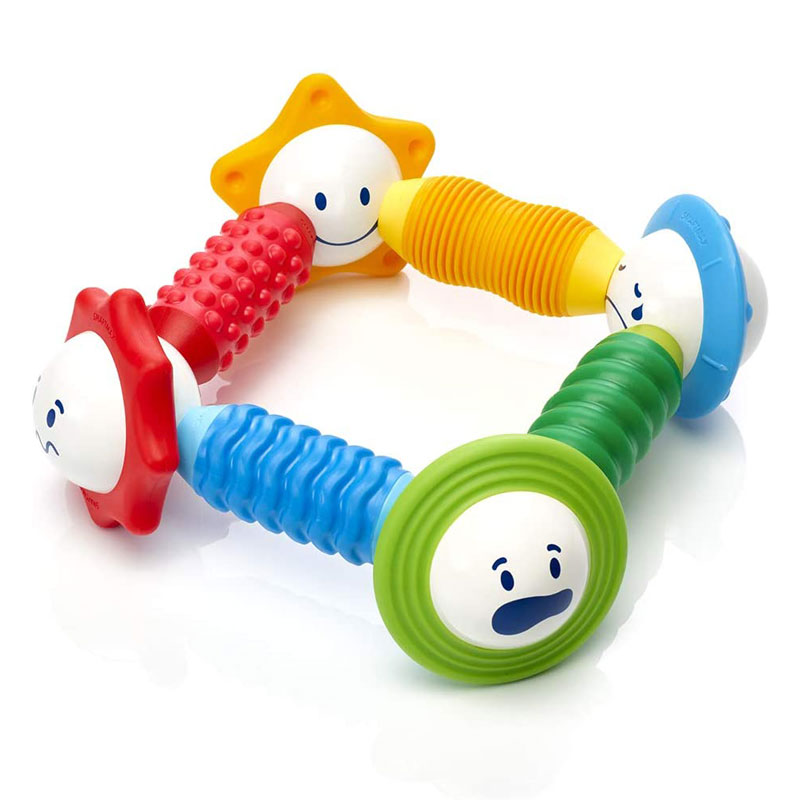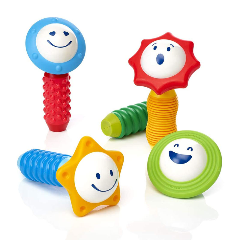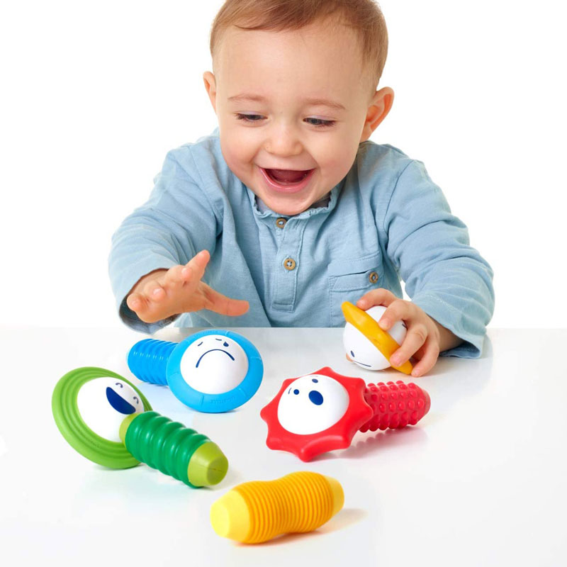 - 1~2歲的幼兒,可透過刺激感官知能,培養基本身體動作及穩定性動作(例如:抓、握、搖、揮動、大肌肉發展)、觸覺靈敏度以及辨認表情搖鈴的四種不同聲音