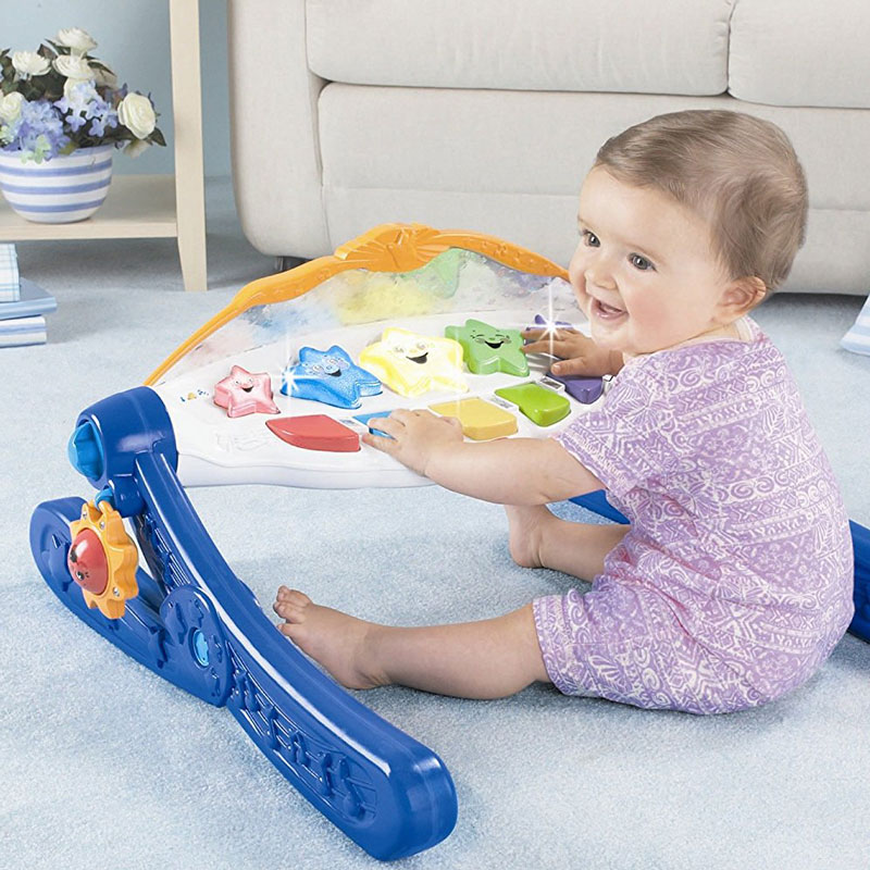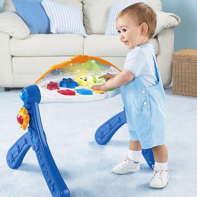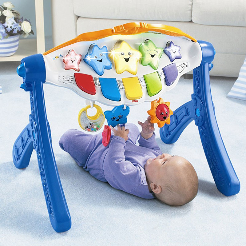 - 初生兒使用,寶寶躺在健身器下方抓玩上方玩具,按任一鍵則會有音樂及燈光持續不斷出現