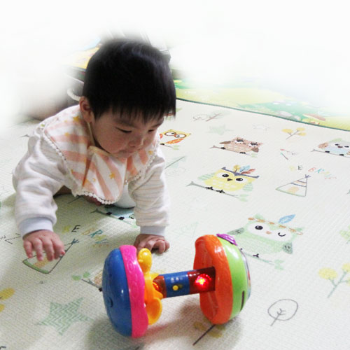 貼心建議 增加遊戲墊的種類,在硬平面鋪設遊戲墊,大量的吊飾玩具會吸引寶寶抓握進而做翻身練習